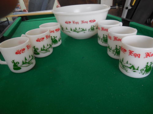 Title (ebay affiliate link): VINTAGE ANCHOR HOCKING CHRISTMAS HOLIDAY EGG NOG MILK GLASS PUNCH BOWL + 6 cups