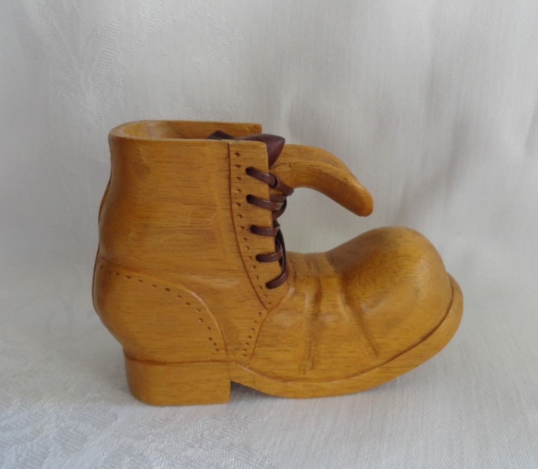 Title (ebay affiliate link): Hand Carved High Top Shoe with Hitchhiker Butternut and Walnut Wood Grether 1982