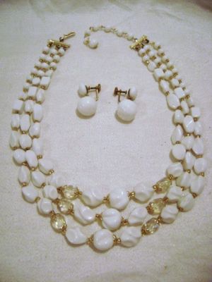 Vintage JAPAN Milk Glass & AB Crystal Necklace Set