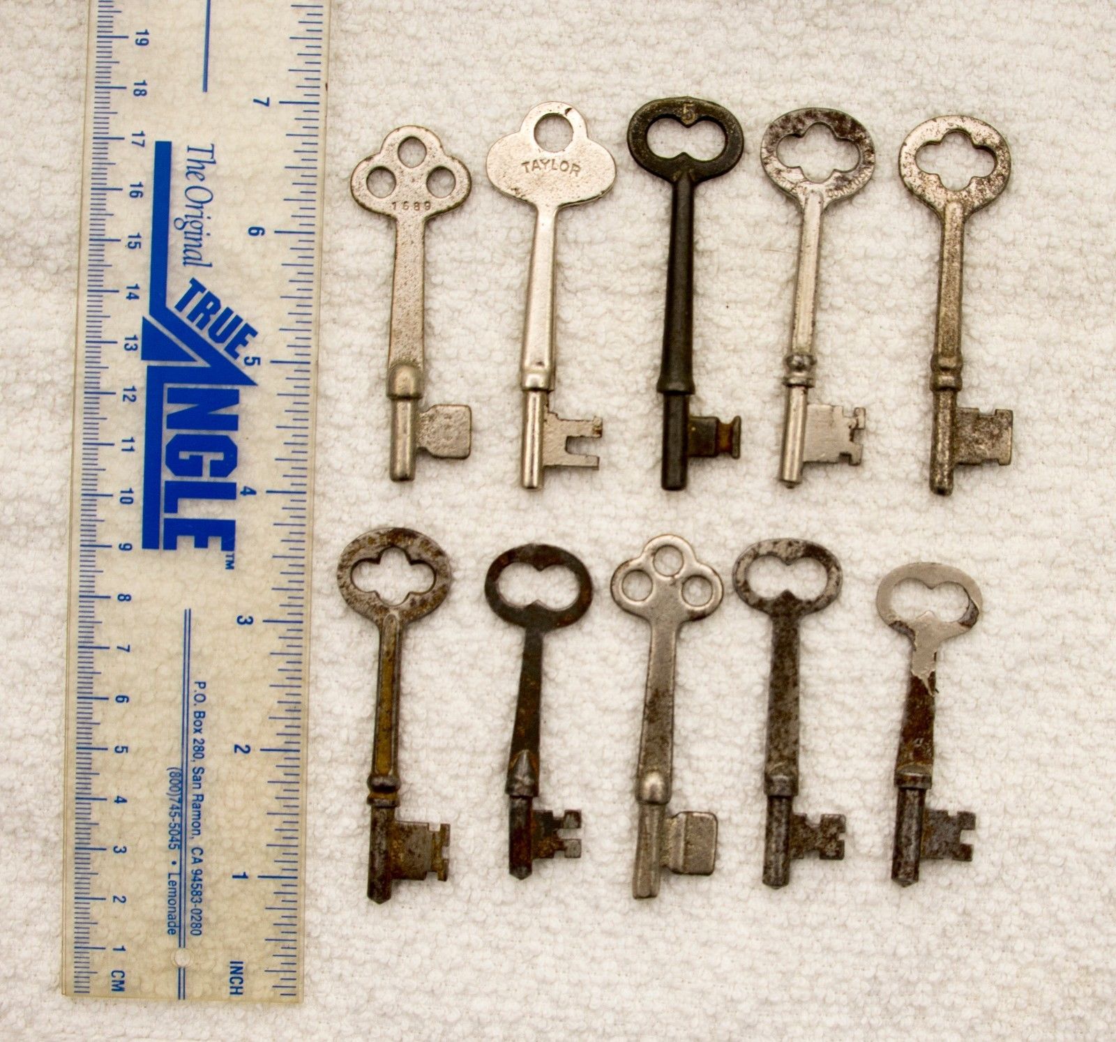 Vintage antique lot of 10 single bit solid barrel skeleton keys lock furniture