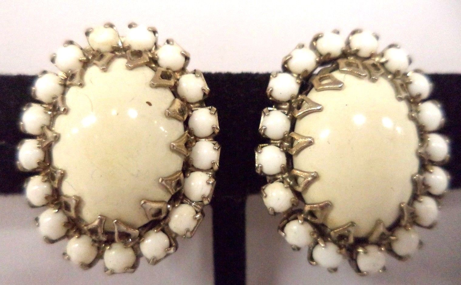 Title (ebay affiliate link): VINTAGE ESTATE HIGH END MILK GLASS RHINESTONE FLOWER 1" CLIP EARRINGS!!! G235H