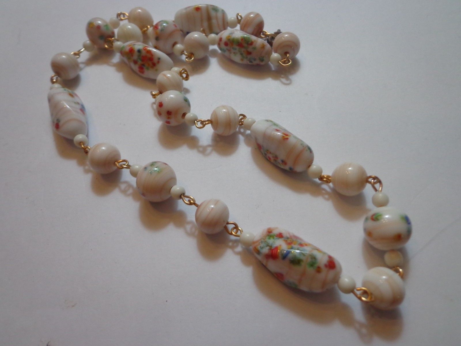 VINTAGE 50''S WHITE MILK GLASS SPECKLED MOLDED NECKLACE 18 IN WIRE WRAPPED