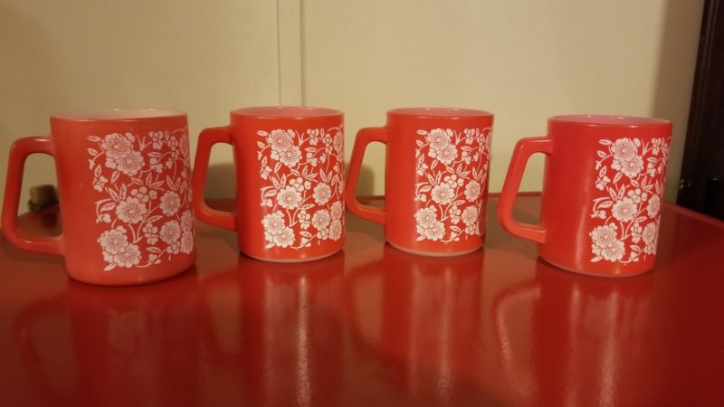 Title (ebay affiliate link): Lovely Vintage Federal Milk Glass Red Cherry Blossom Flower Coffee Mugs