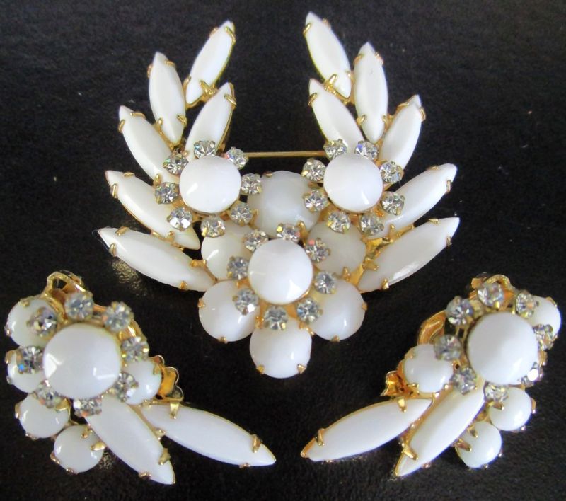 Title (ebay affiliate link): JULIANA Verified White Milk Glass Rhinestone Vintage Pin Earring Set