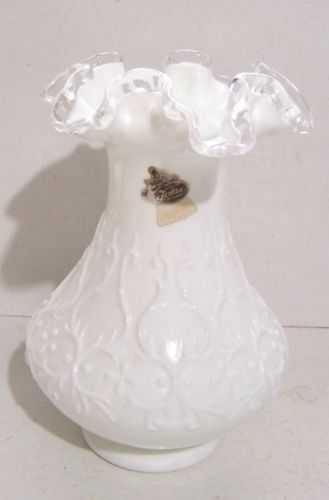 Title (ebay affiliate link): Fenton Spanish Lace Silver Crest Vase 8" Tall Ruffle Rim w/Label -Milk Glass