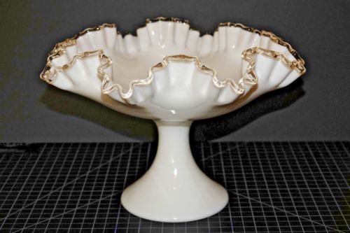 Title (ebay affiliate link): FENTON MILK GLASS SILVER CREST PEDESTAL FRUIT BOWL WITH SCALLOPED EDGE