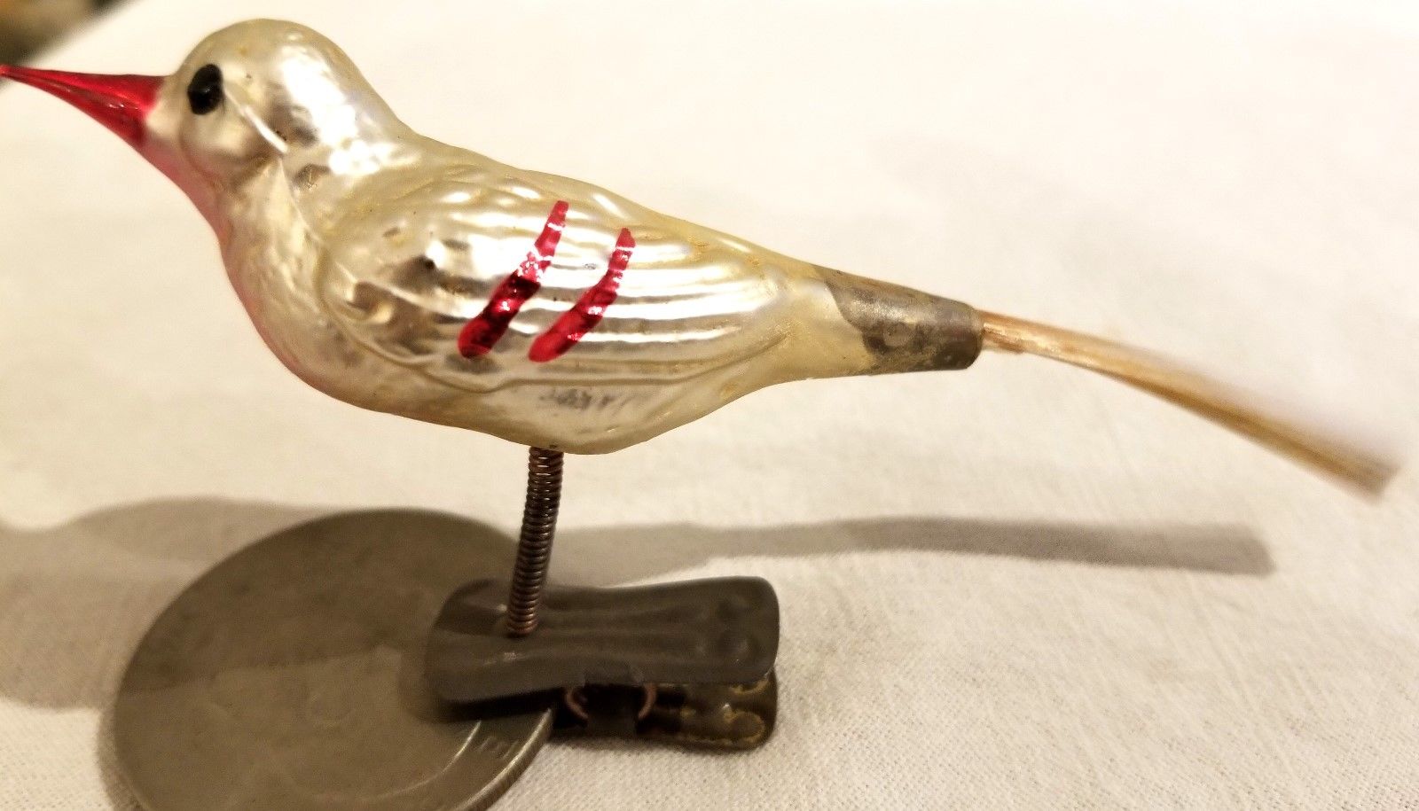 Title (ebay affiliate link): Pearl lacquered glass Song Bird, on Clip. 1920s. German. White spun glass tail