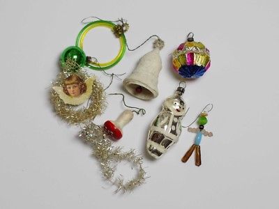 8 x Vintage Glass,spun coton Christmas Ornament,snowman, lantern, bell, angel