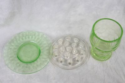 L16 DEPRESSION GREEN URANIUM PLATE GOBLET, FLOWER FROG