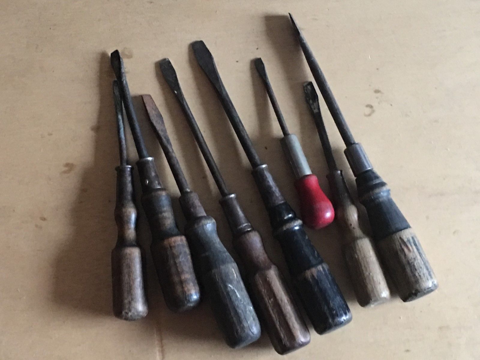 Title (ebay affiliate link): VINTAGE LOT WOODEN HANDLE FLAT HEAD SCREW DRIVERS SET OF 8 PC MULTIPLE SIZE