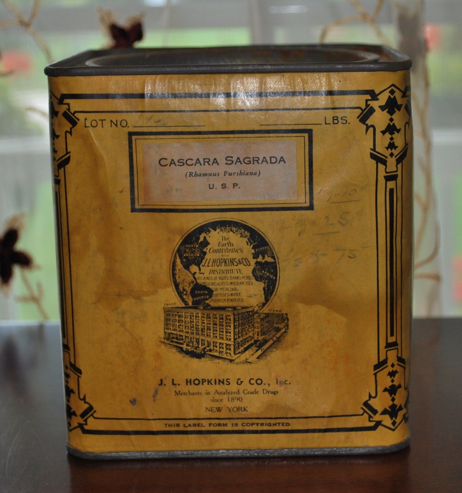 ANTIQUE PHARMACY MEDICINE CASCARA SAGRADA LARGE CARDBOARD TIN WITH CONTENTS