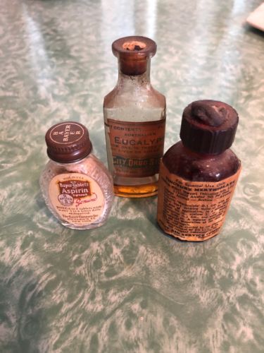 Title (ebay affiliate link): Vintage Antique Medicine Pharmaceutical Bottles, Aspirin, Eucalyptus Oil