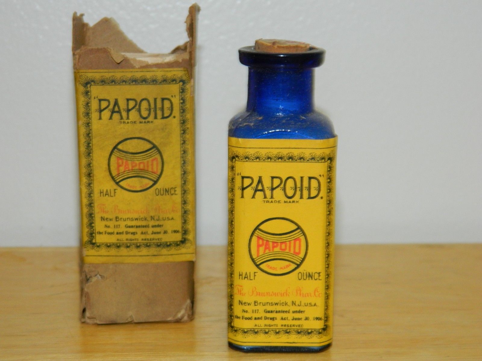 Title (ebay affiliate link): Antique Apothecary Drugstore Cobalt Blue Glass Bottle Papoid Brunswick Shar Co