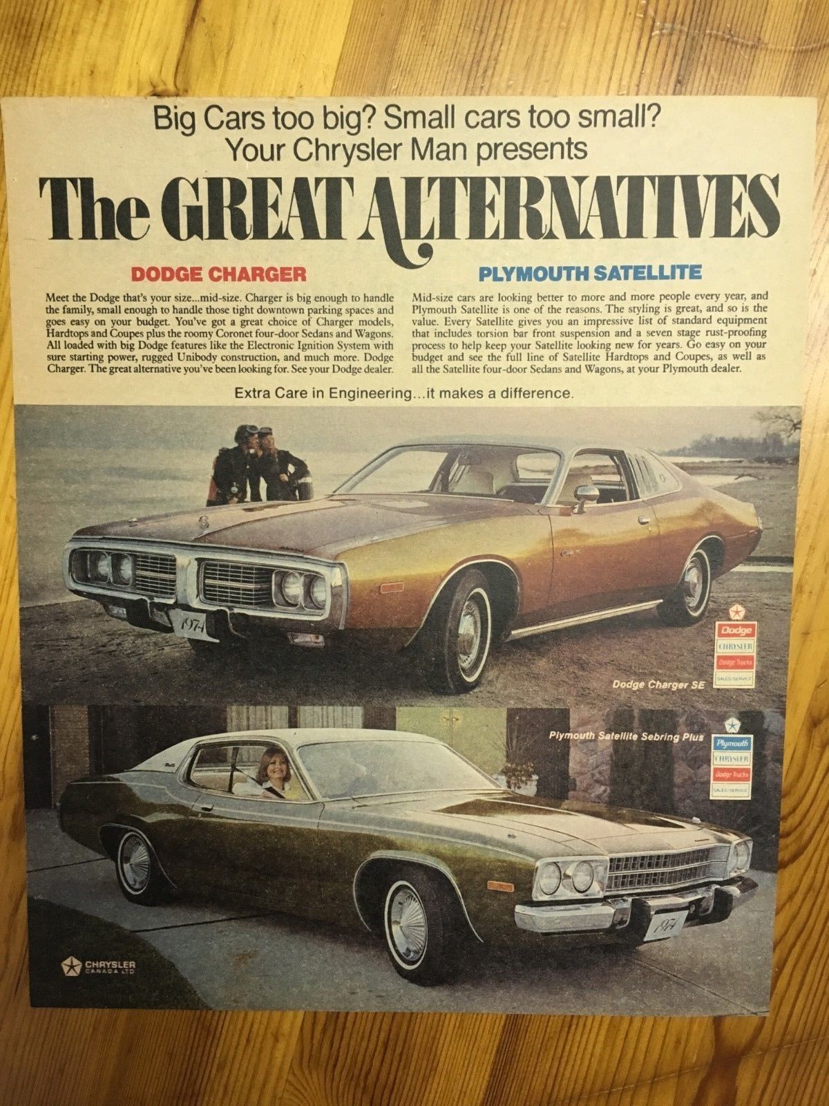 STUNNING CANADIAN CAR AD CANADA 1974 DODGE CHARGER PLYMOUTH SATELLITE SEBRING