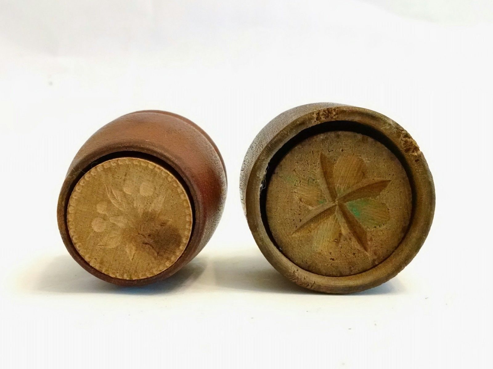 PRIMITIVE VINTAGE WOOD SMALL BUTTER MOLD STAMP PRESS LOT OF 2