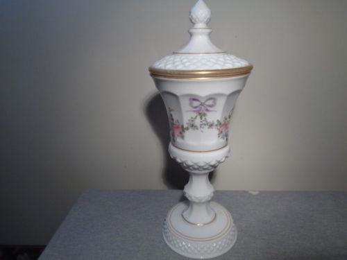 Title (ebay affiliate link): Westmoreland Milk Glass Roses & Bows Hand Painted Tall Candy Urn