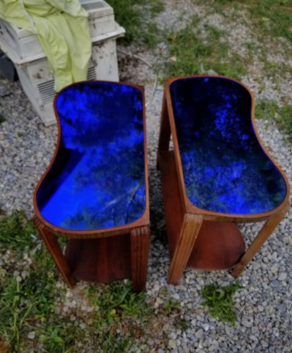 Title (ebay affiliate link): Vintage Art Deco Wood EndTables With Cobalt Blue Mirrored Glass Top
