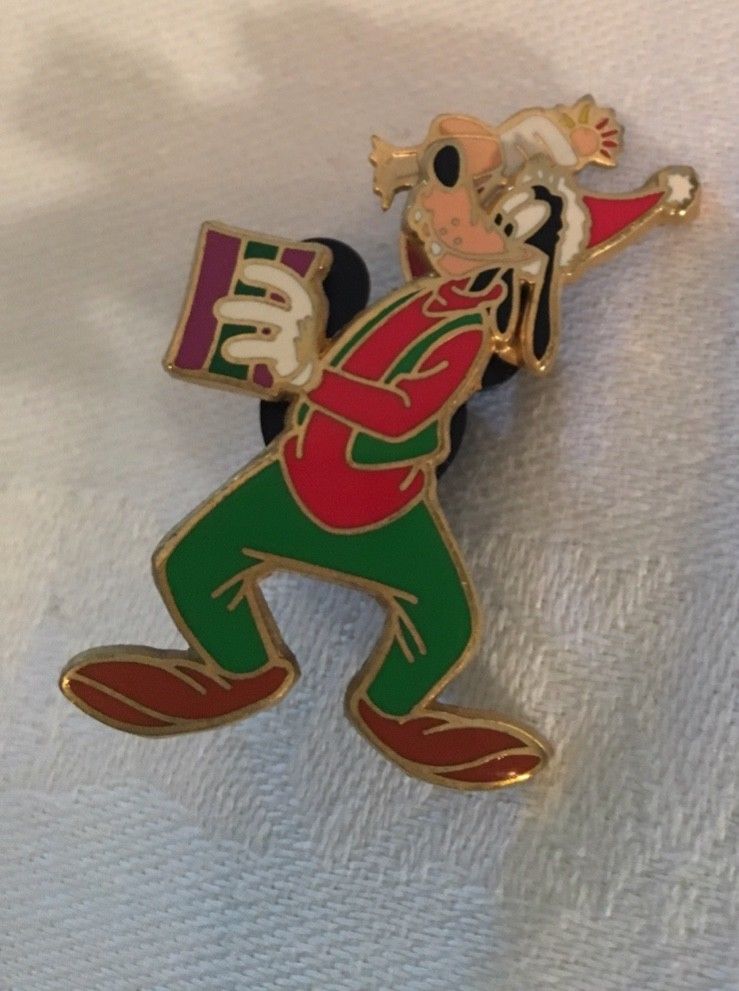 Title (ebay affiliate link): Disney LE Pin WDW A Gift for Goofy Christmas Rubber Chicken Present HINGED