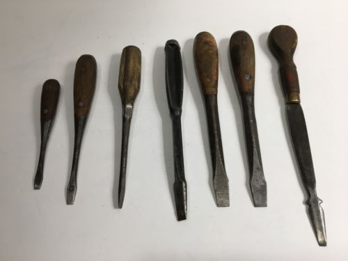Title (ebay affiliate link): LOT OF 7 ANTIQUE EARLY VINTAGE FLAT HEAD SCREWDRIVERS METAL AND WOOD HANDLES