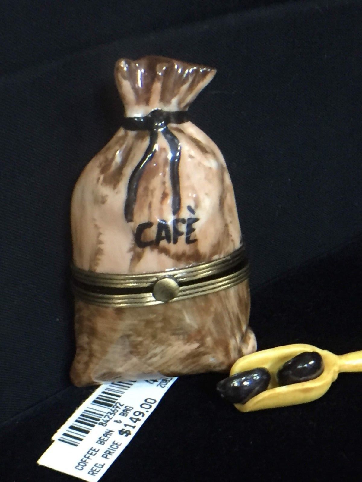 Title (ebay affiliate link): Antique Limoges Porcelain Peint Main: Coffee Bean Bag with Scoop Trinket Box
