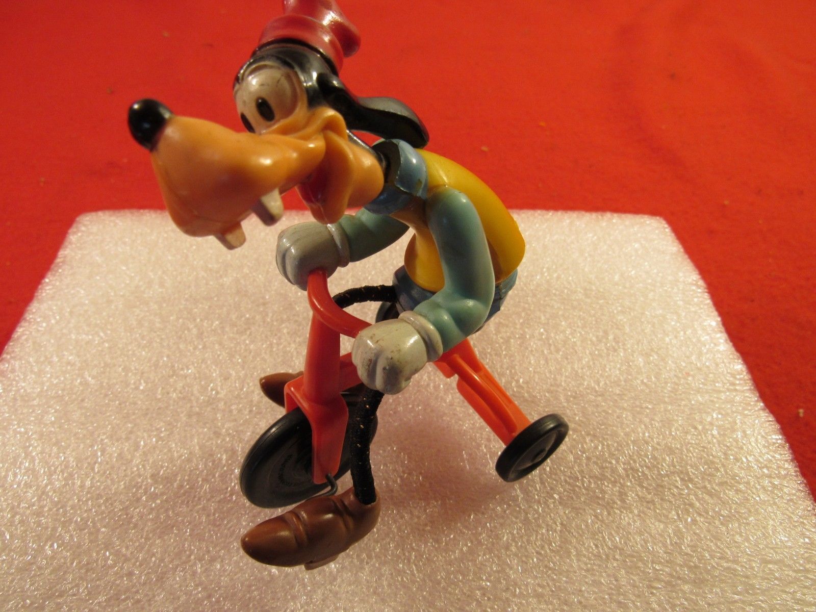 VINTAGE WALT DISNEY "GOOFY" RIDING BICYCLE SMALL PLASTIC PUSH TOY