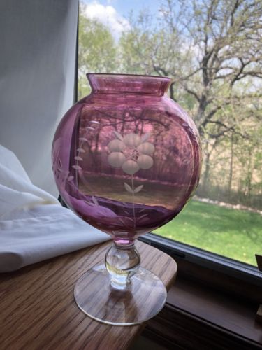 Title (ebay affiliate link): Cranberry Glass Vase Antique Ball Shaped W/ Cut Etched Ivy and Floral Design