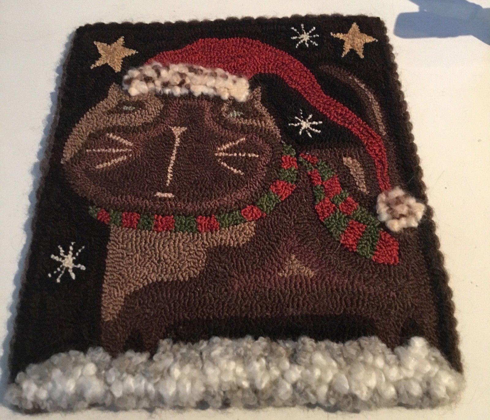 Primitive Needle Punch Mat *Santa Cat* Home Decor Table Mat Christmas Holiday