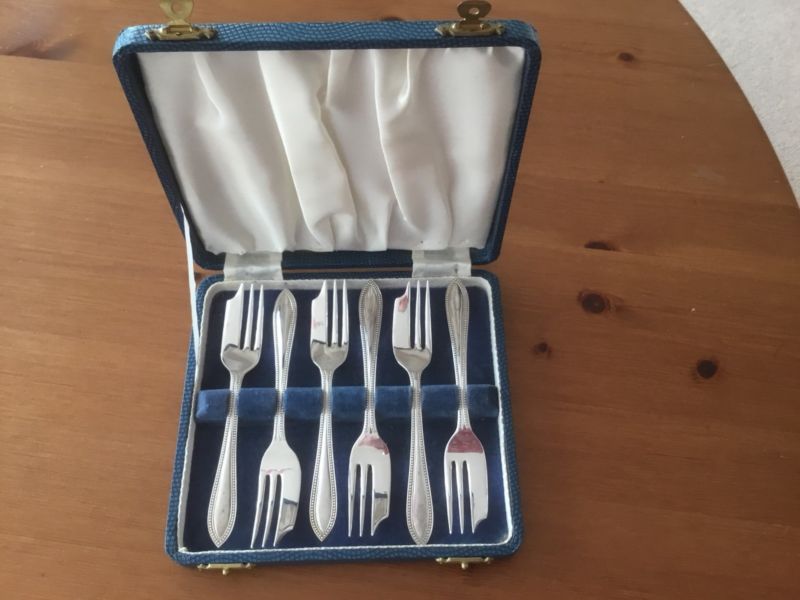 Title (ebay affiliate link): 6x Yeoman Silver Plate -EPNS Pre-1950 Pastry Forks In Original Case