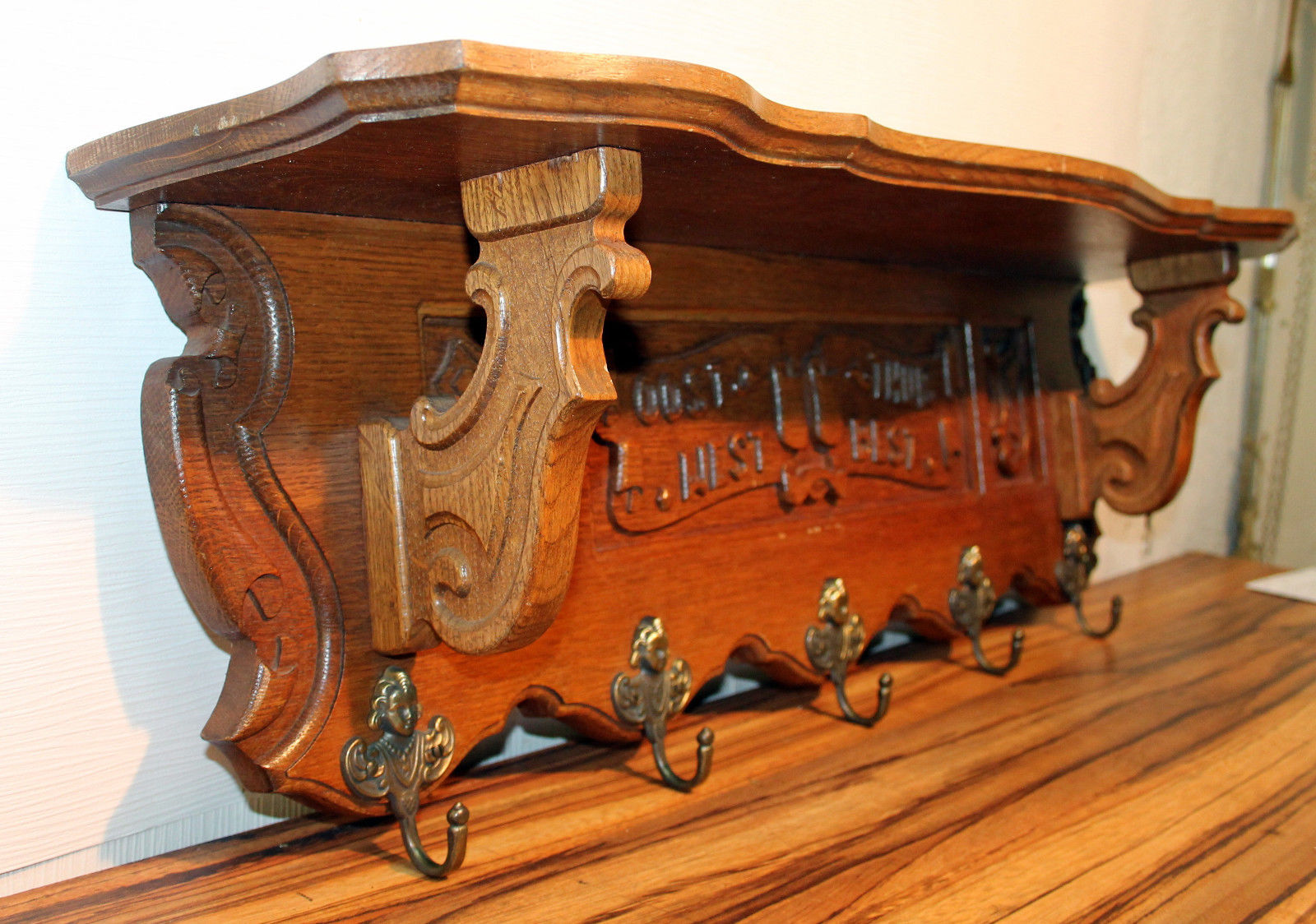 Title (ebay affiliate link): Old Coat hanger in Oak wood hand carved with brass Angel hooks