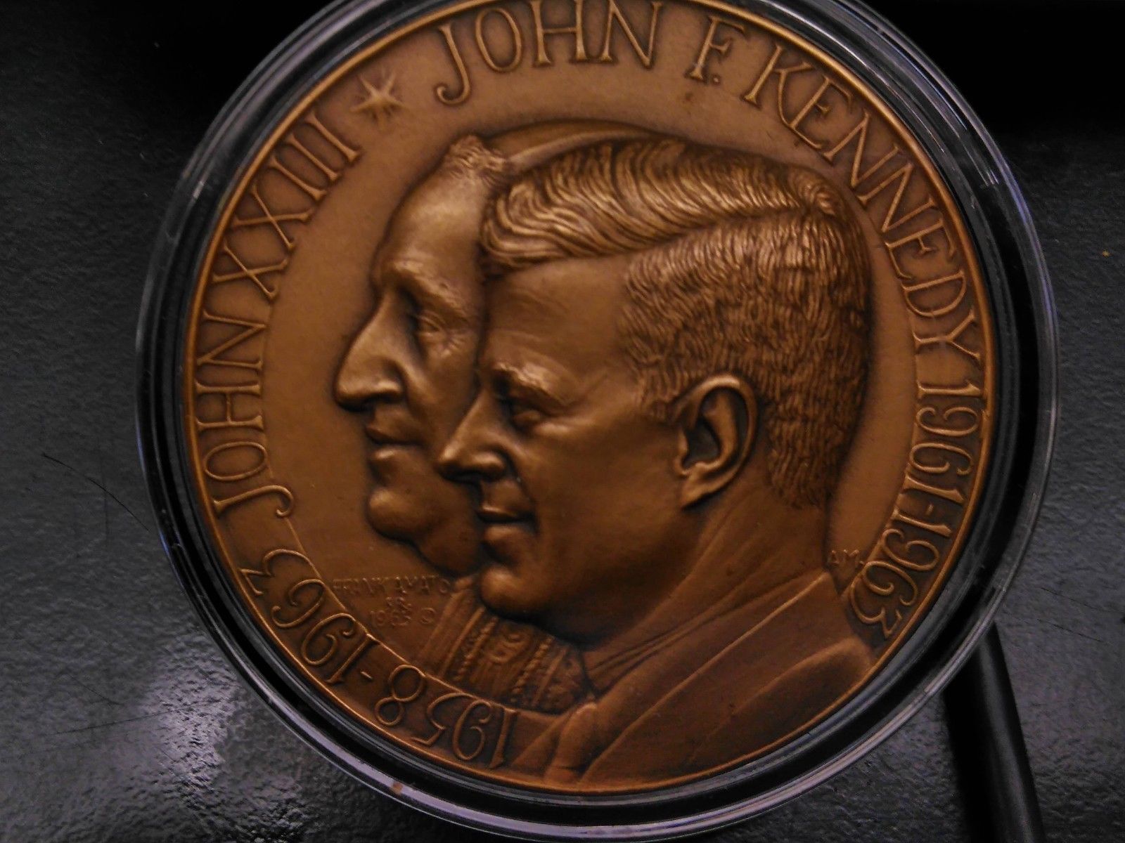 Title (ebay affiliate link): John F Kennedy w/ Pope John XIII Medallic art Co tribute medal, 62 mm
