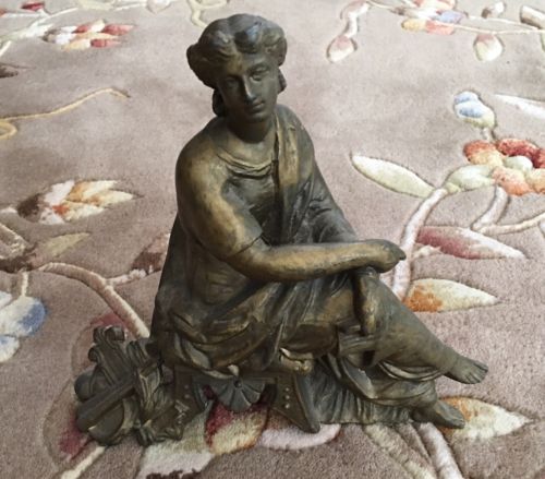 Title (ebay affiliate link): Antique Old Cast Metal Bronze Toned LADY SEATED ON PEDESTAL Clock Topper