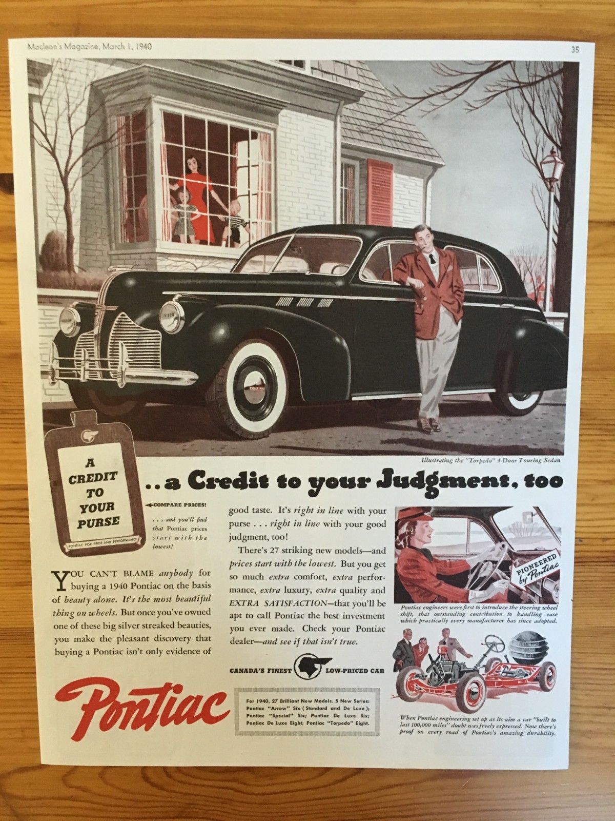 Title (ebay affiliate link): STUNNING 1940 CANADIAN PONTIAC CAR AD CANADA MODEL TORPEDO TOURING SEDAN