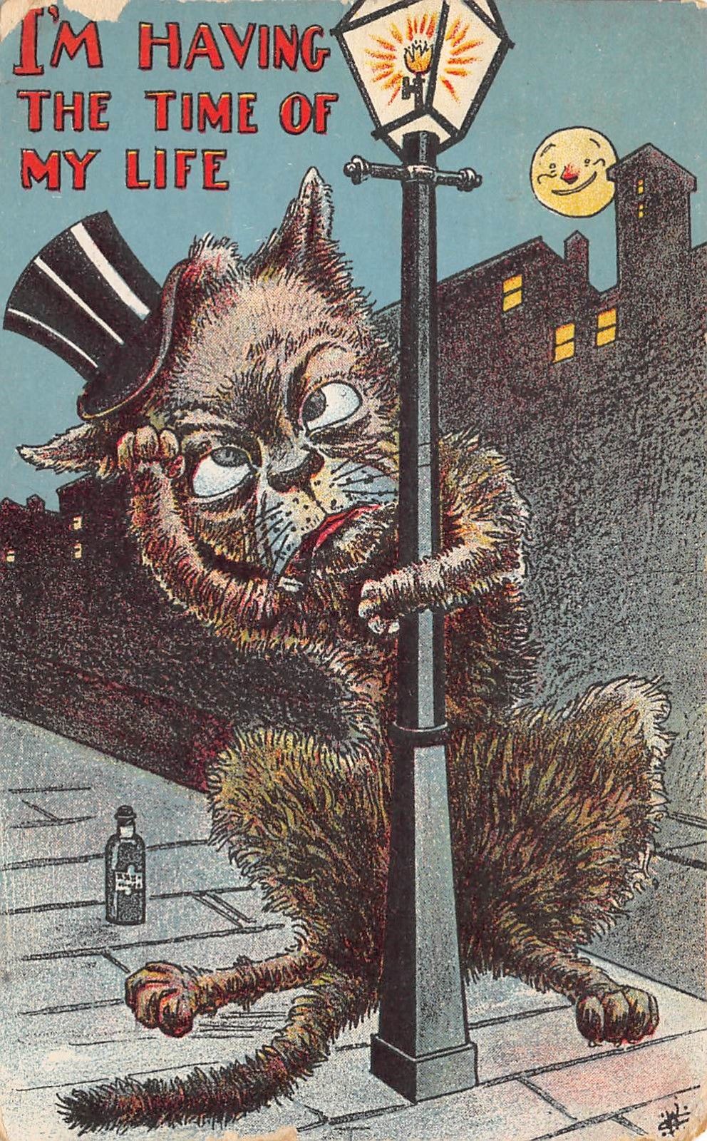 Title (ebay affiliate link): CAT Humor Comic 1910 Postcard Time Of My Life Drunk Cat Smoking Cigar Top Hat