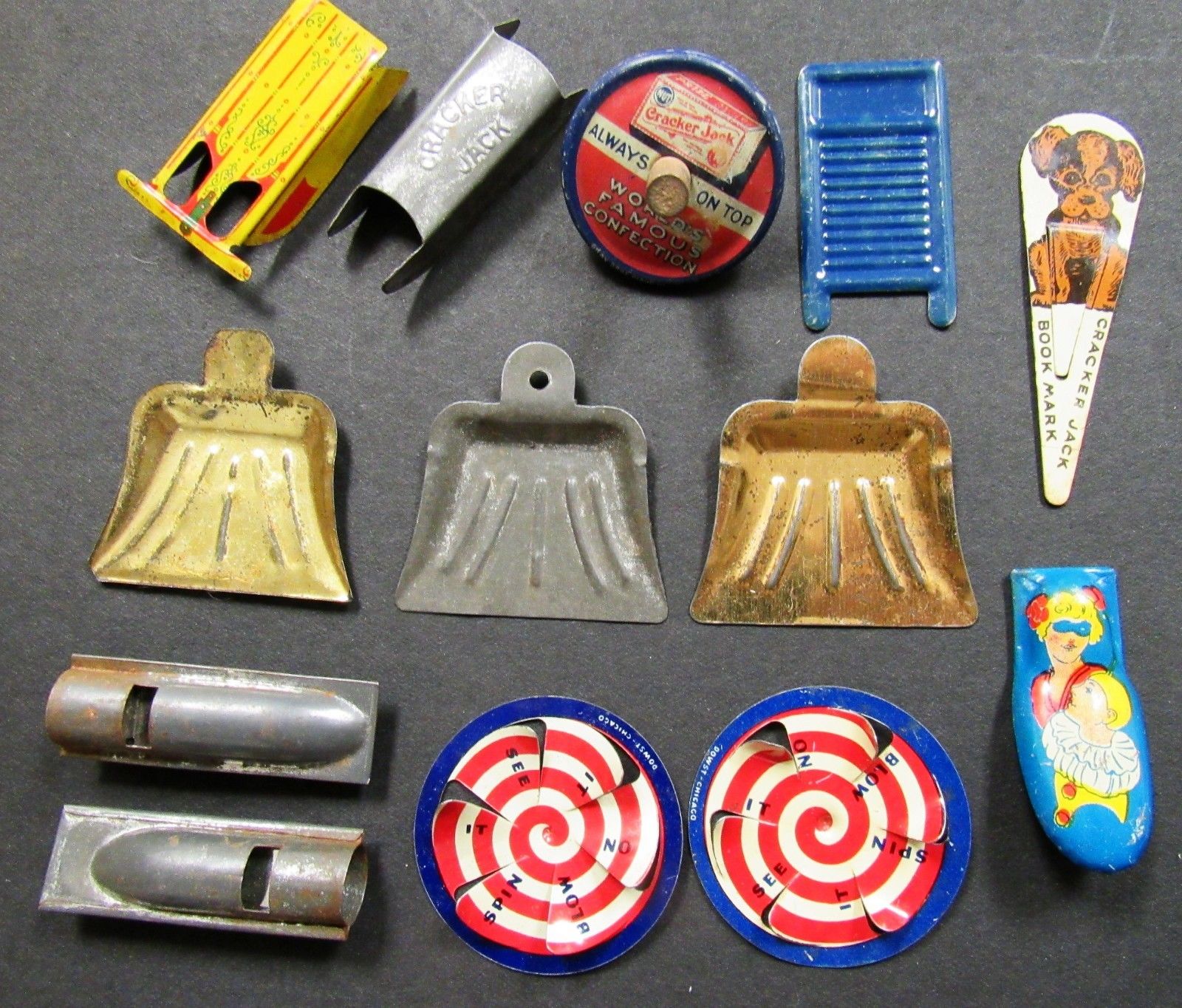 Title (ebay affiliate link): 13 Vintage CRACKER JACK Prize Tin Toys Whistles~Spinners~Bookmark~Sleds & More