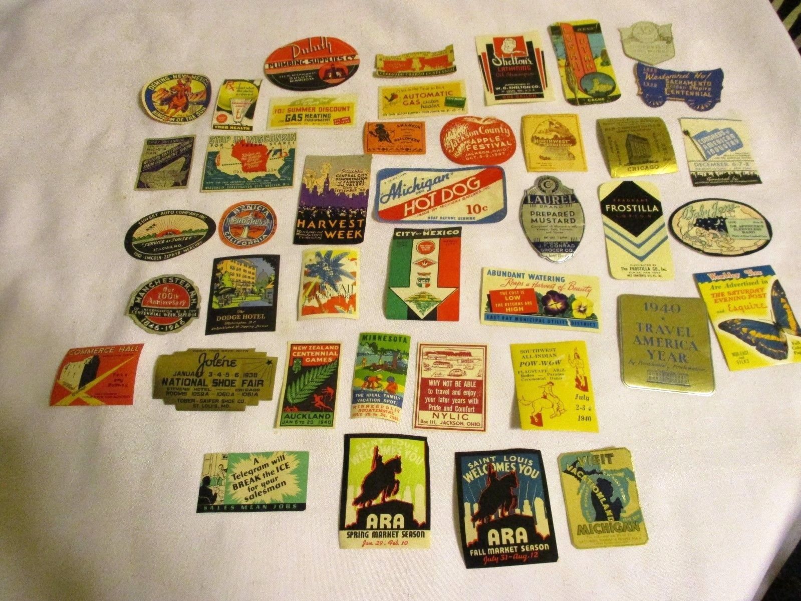 Title (ebay affiliate link): FORTY ONE VINTAGE STICKERS/LABELS OF ADVERTISING, FESTIVALS, HOTELS MUCH MORE