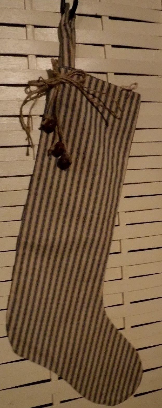 Title (ebay affiliate link): Primitive pioneer Christmas stocking bells blue ticking stripe tea stain