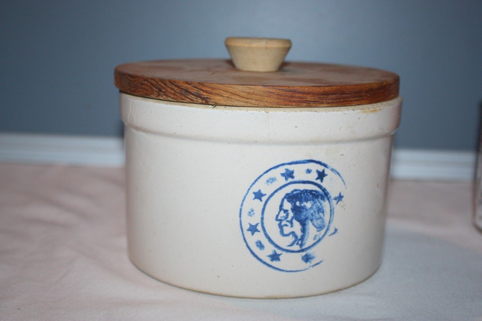 Title (ebay affiliate link): Small Louisville Indian Head Crock with Homemade Wooden Lid One Quart