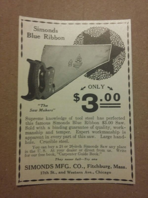 1918 Simonds Blue Ribbon Saw Ad Fitchburg, Massachusetts