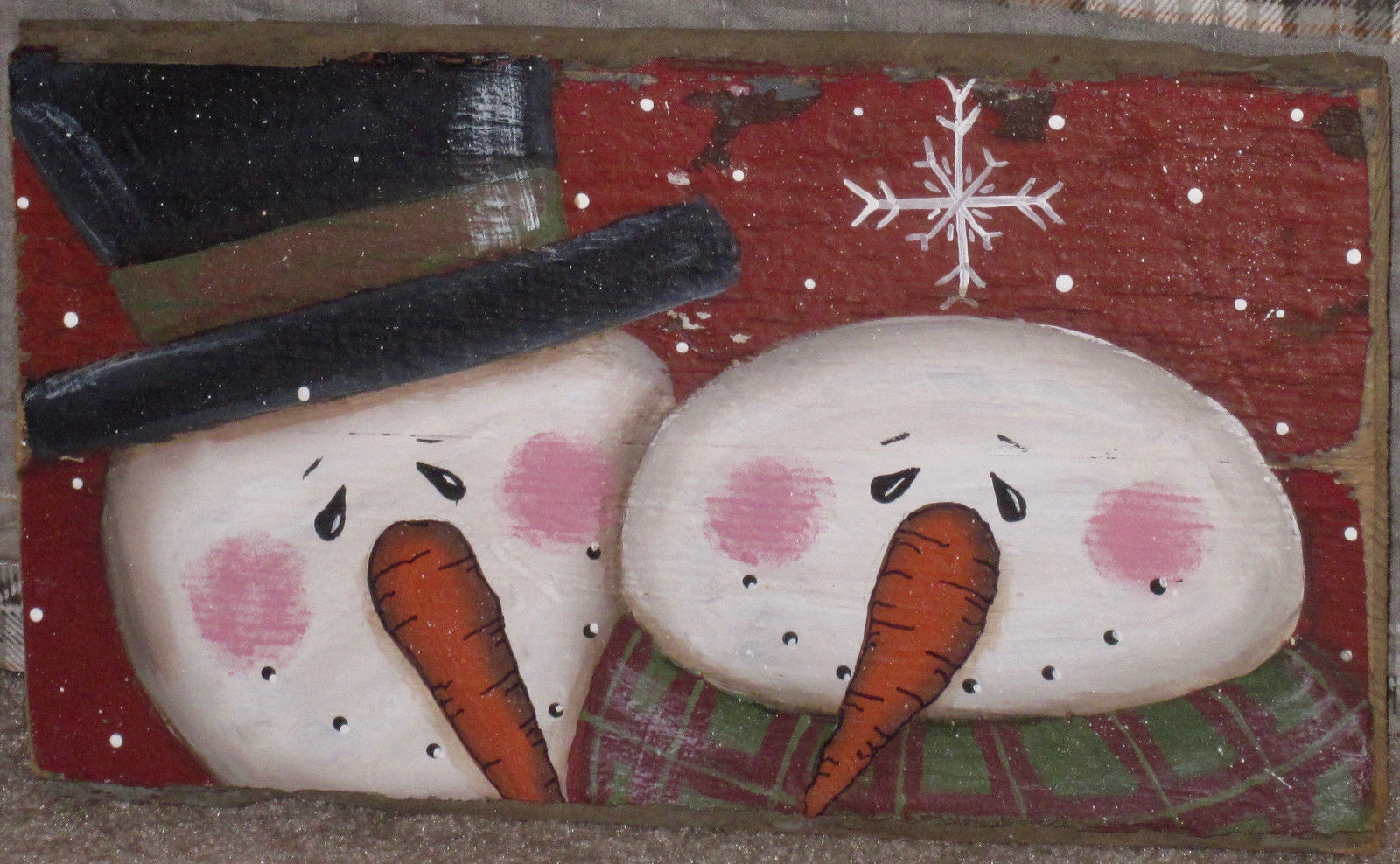 Title (ebay affiliate link): *~*PRIMITIVE*~* HP FOLK ART SNOWMEN COUPLE *~* WINTER *~* OLD RECLAIMED WOOD