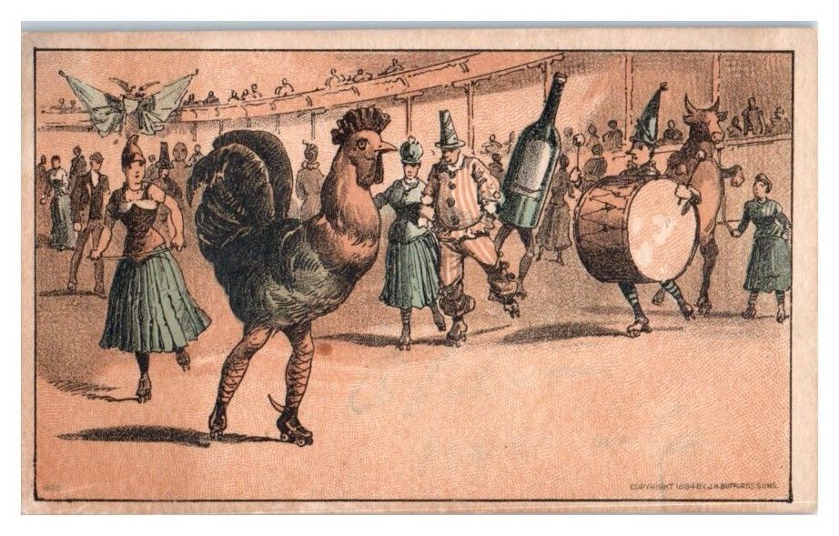 Title (ebay affiliate link): Rollerskating Rooster, Tabernacle Roller Rink, Decatur, IL Victorian Trade Card