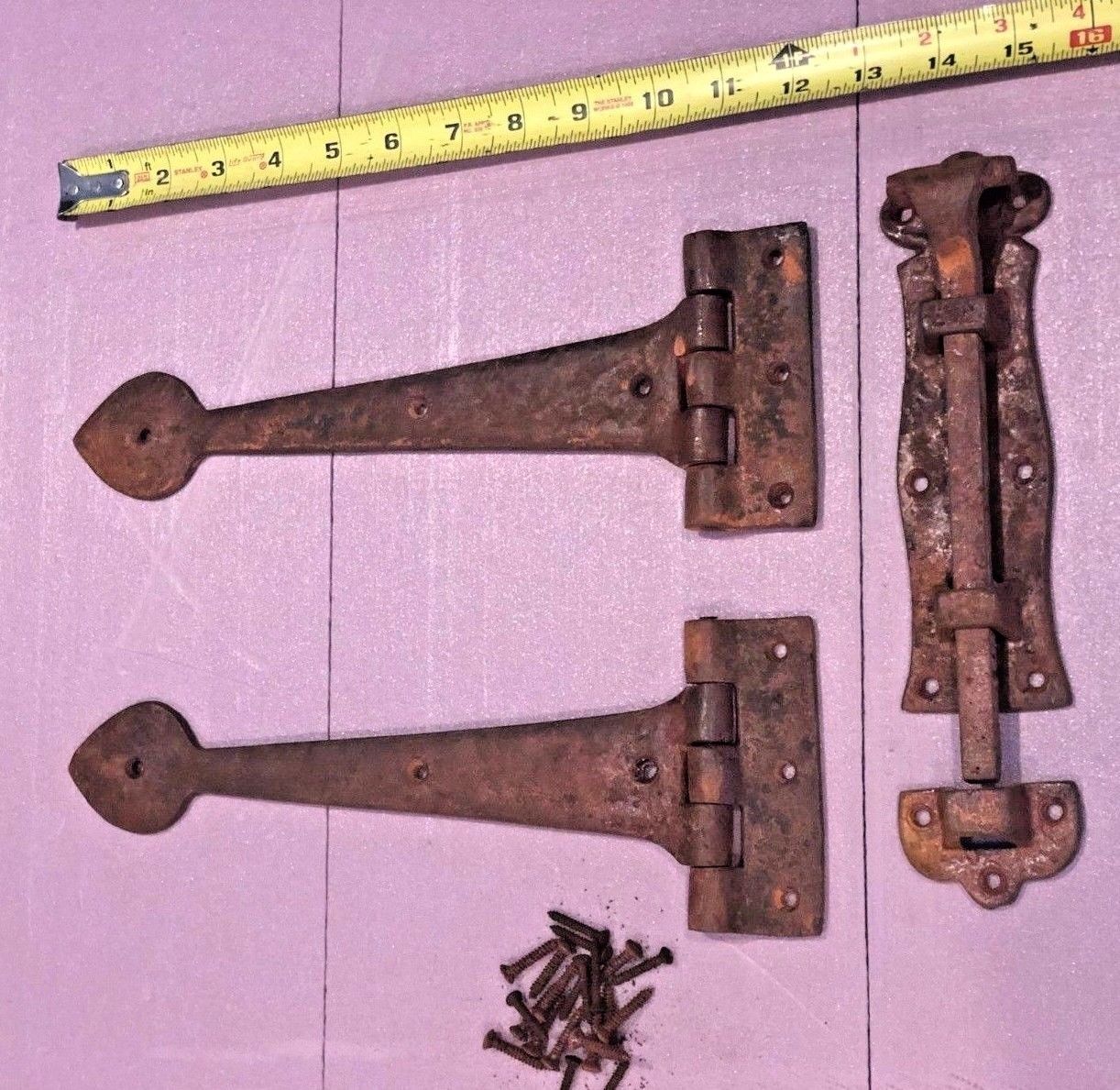 2 Vintage Heavy Barn Door Hinges & 1 Barn Gate Door Lock - Cast Iron - w/Screws