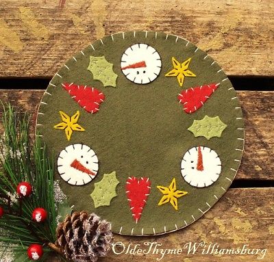 Title (ebay affiliate link): Primitive Stitchery CHRISTMAS Snowmen Holly Stars Penny Rug ~ Winter Candle Mat