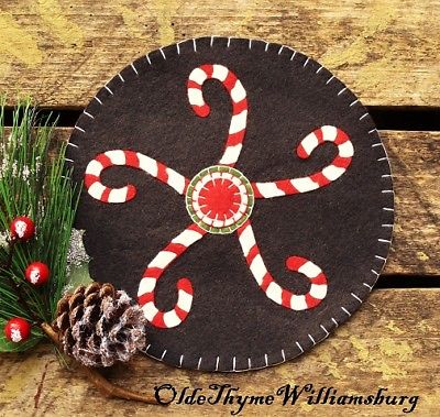 Title (ebay affiliate link): Primitive Stitchery CHRISTMAS Candy Canes Penny Rug ~ Winter Candle Mat
