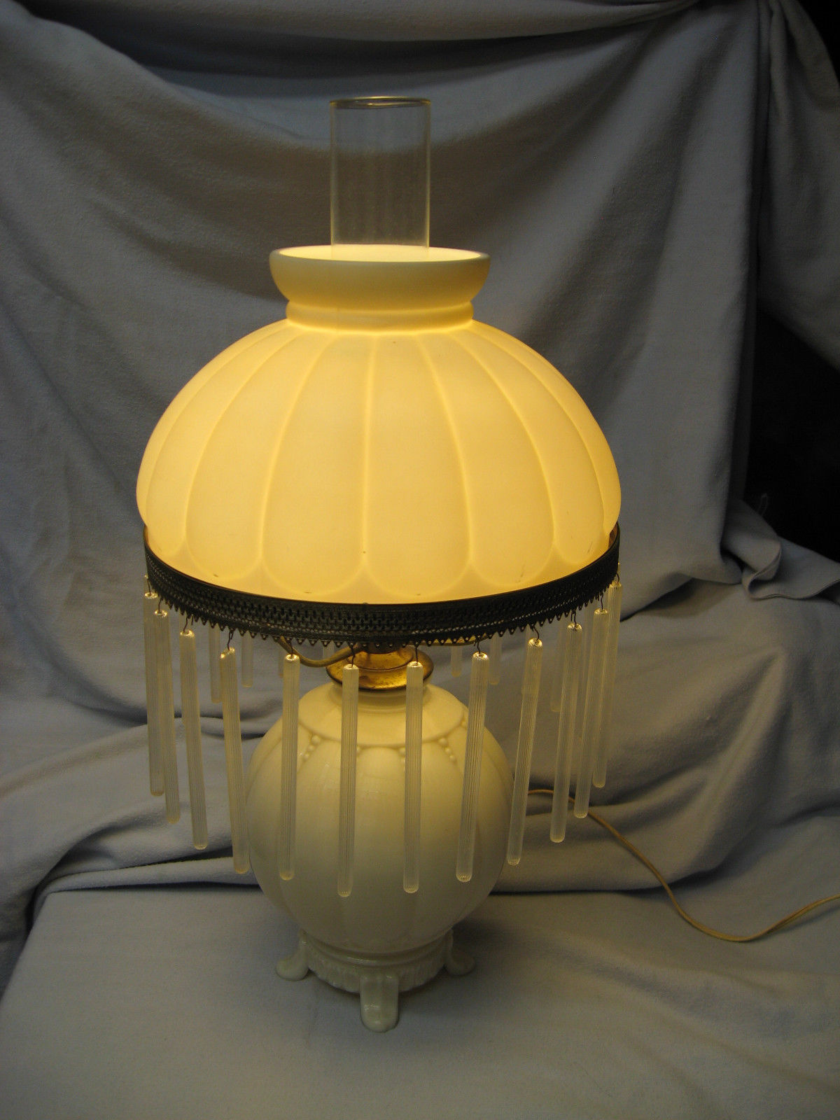 Title (ebay affiliate link): Vintage Milk Glass Lamp w/hurricane globe dome shade & glass dangle fringe