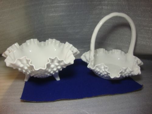 Title (ebay affiliate link): 2 VINTAGE FENTON HOBNAIL MILK GLASS CRIMPED RUFFLED BASKET THREE FOOTED BOWL