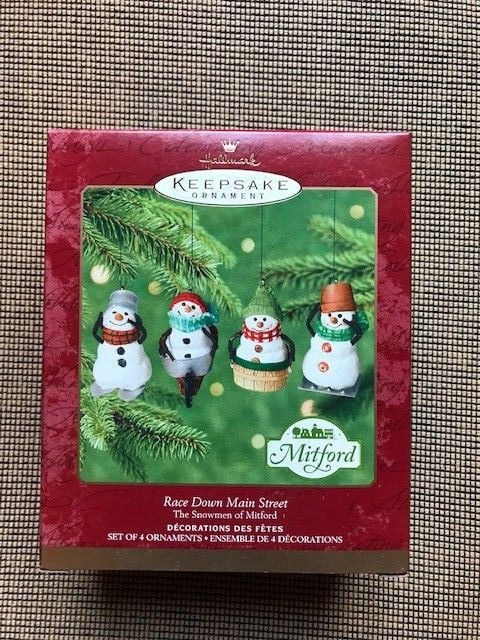 Title (ebay affiliate link): NIB Hallmark Keepsake Ornament Race Down Main Street Mitford Snowmen Set of 4!