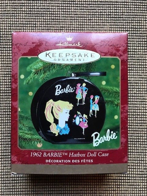 Title (ebay affiliate link): NIB Y2K Hallmark Keepsake Ornament 1962 Barbie Hatbox Doll Case VINTAGE
