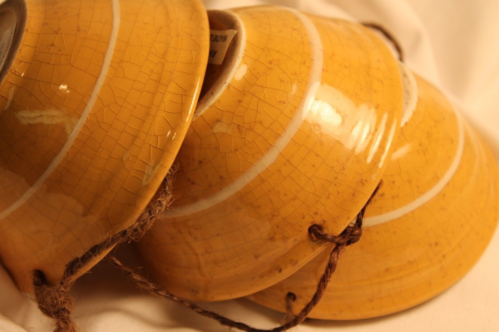 Title (ebay affiliate link): Vintage Ragon House Yellow Ware Pottery Bowl Ornaments Lot Of (3)