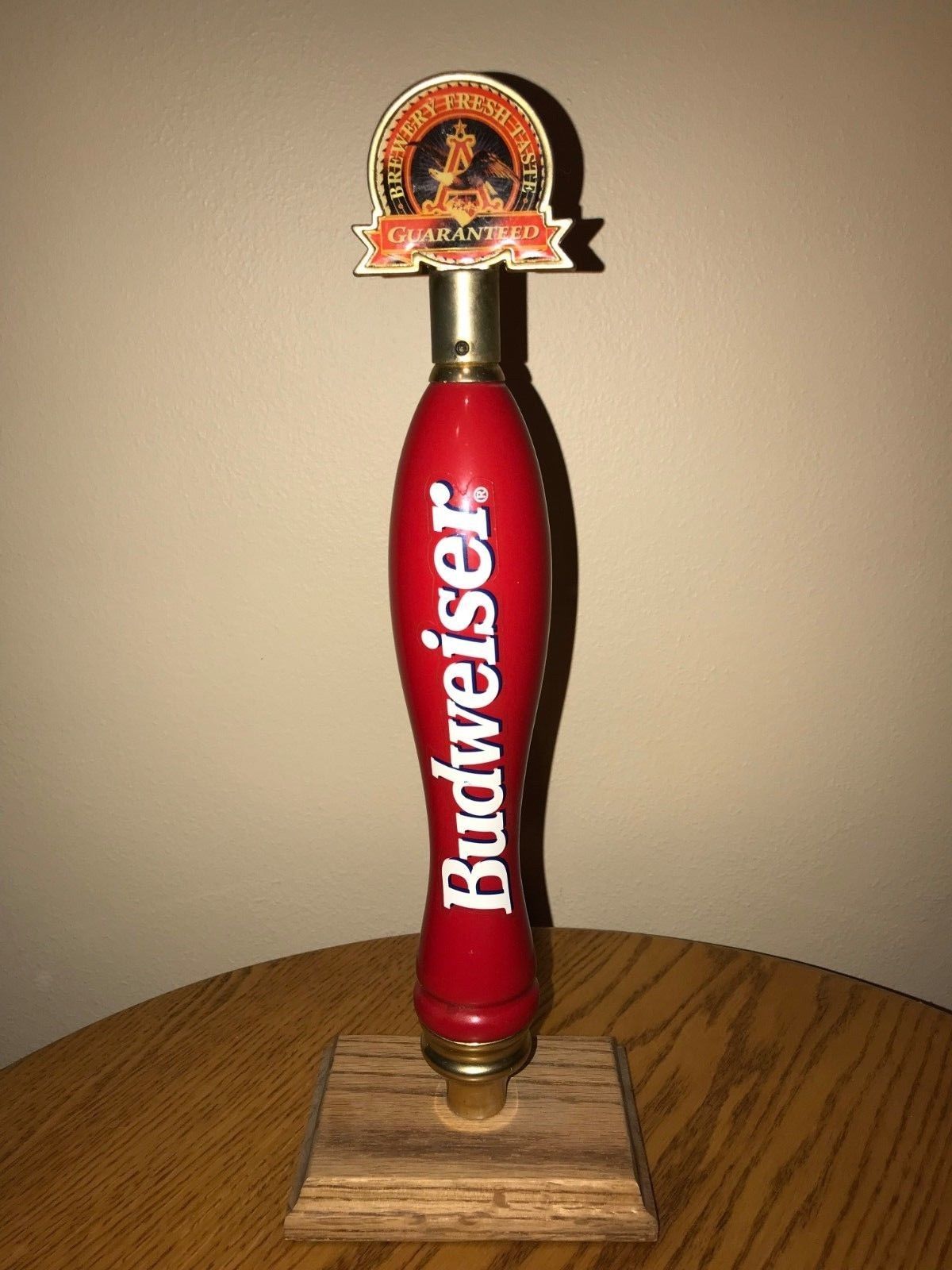 Title (ebay affiliate link): VINTAGE BUDWEISER BEER TAP HANDLE - METAL SEAL TOP - MOUNTED TO WOOD BASE