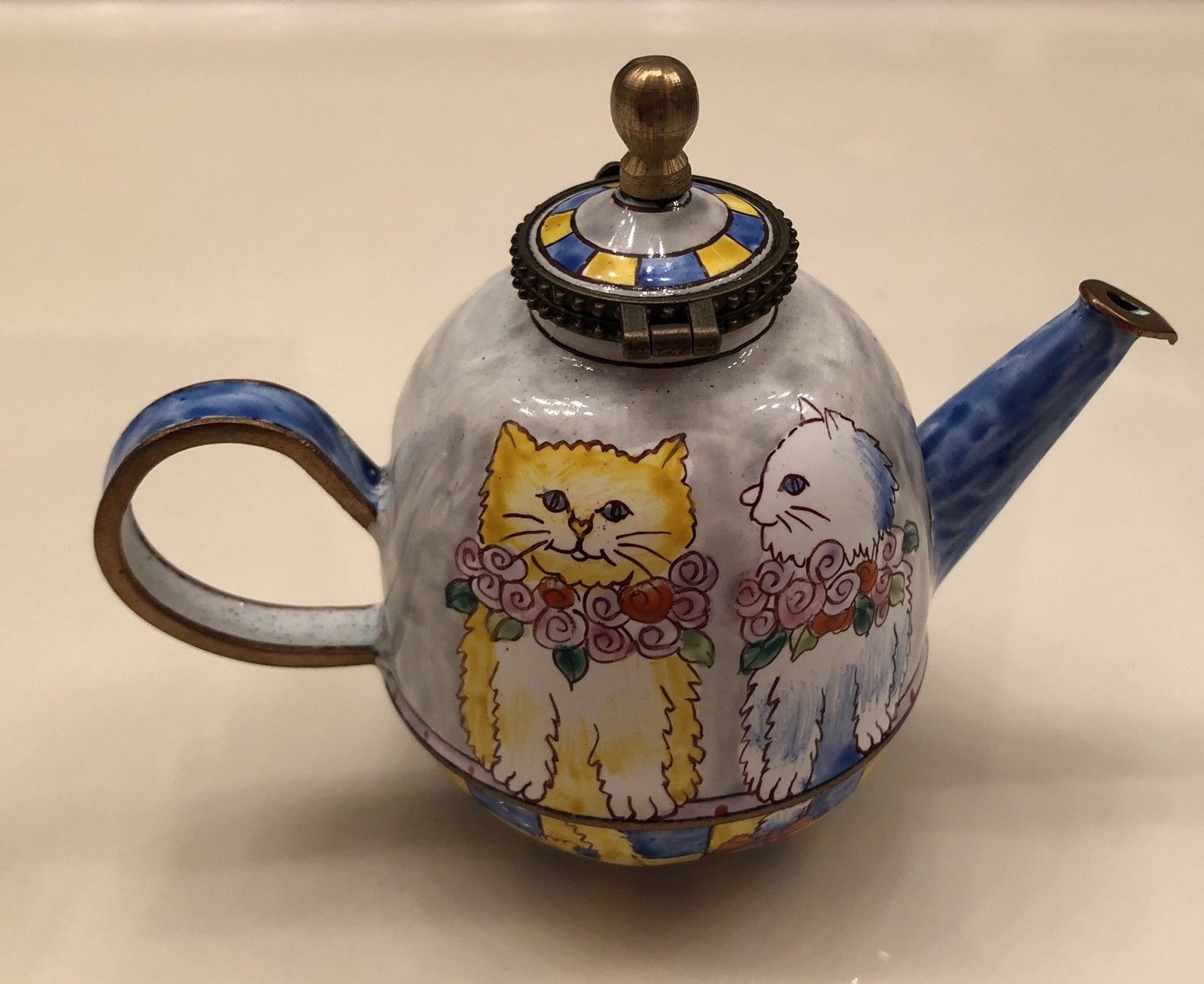 Title (ebay affiliate link): KELVIN CHEN ENAMEL MINIATURE TEAPOT PAINTED CATS 3.25"